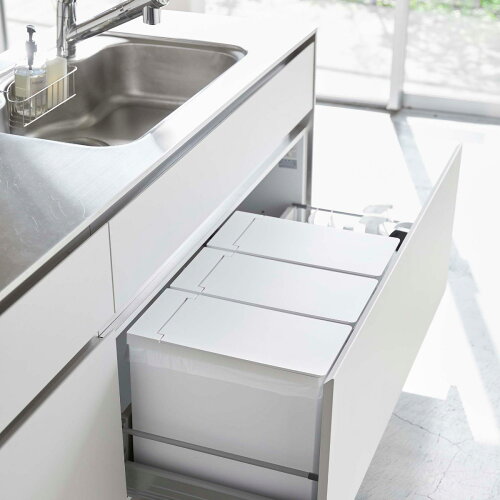 品質表示:蓋・容器・底板:ポリプロピレン 商品サイズ: 容器:約W19×D40×H35cm 蓋開口部:約W19×D40cm×H67cm 内寸サイズ: 容器:約W18×D38×H32.5cm 蓋開口部:約W15.5×D30cm×H30cm 耐荷重:約10kg 容量:約22L 耐熱温度:90℃/耐冷温度-40℃ 組立式 対応サイズ: 45L・30L・20Lのゴミ袋 20・30・45号のレジ袋(関東) 35・40・45号のレジ袋(関西) カラー:ホワイト、ブラックキッチンのシンク下引き出しにスリムな蓋付きゴミ箱 キッチンのシンク下引き出しにも収まる「シンク下蓋付きゴミ箱」。