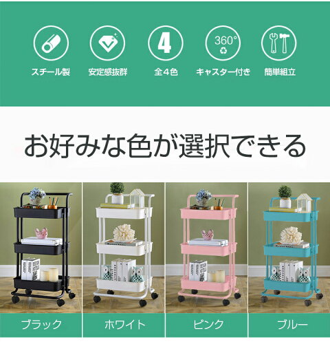様々なシーンで大活躍! 製品仕様 本体サイズ(約):幅42×奥行35×高さ87cm 重量:約3.5kg 耐荷重:約30kg(1段あたり10kg) 材質:スチール 粉体塗装、プラスチック カラー:ブラック、ホワイト、ブルー、ピンク セット内容 本体×1 注意事項 ※測る位置によって、本体サイズの誤差は多少発生します。