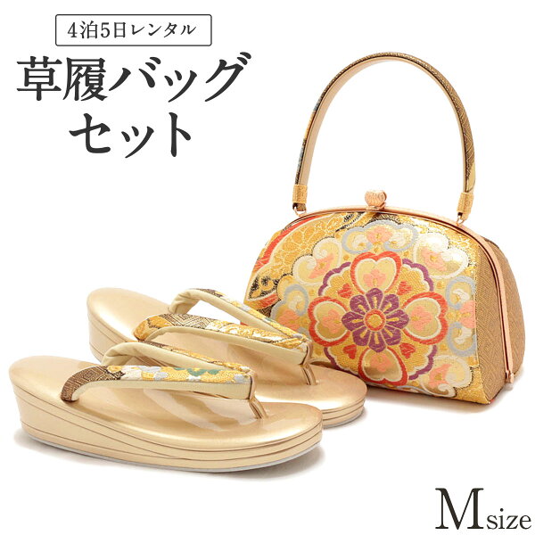 色・柄 色:バッグ・花緒:ゴールド / 草履台:金箔入りゴールド 柄:桜華紋 サイズ ■バッグ:高さ約13.0cm 幅約21.0cm 奥行約11.3cm 総高さ(持ち手含む)約25.0cm ■草履:Mサイズ 長さ約23.8cm 幅約8.0cm 高さ約5.0cm (つま先〜前坪:約3.8cm、前坪〜かかと:約19.3cm) 着 物 振袖 袴 訪問着 付け下げ 色無地 【フォーマル】 用 途 成人式 謝恩会 結婚式 披露宴 パーティーなど 季 節 オールシーズン ご利用期間 4泊5日 (ご利用日2日前のお届けになります。