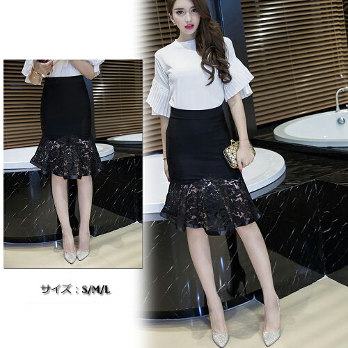 タイトスカート ひざ丈 レーススカート ハイウエスト 裾フレア フィッシュテイルスカート(T)