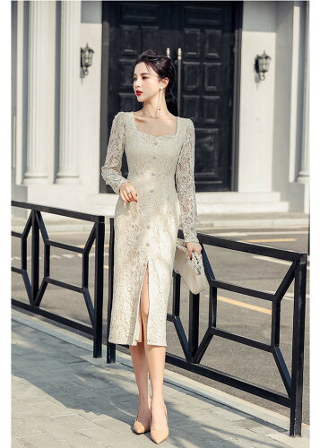 女性 レース スクエアネック ワンピース スリム タイトスカート セクシー スプリット(T)
